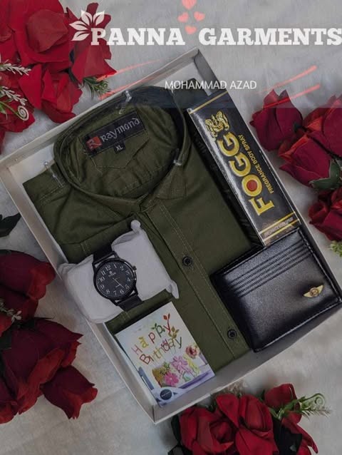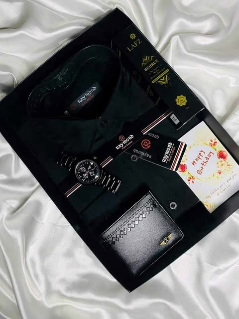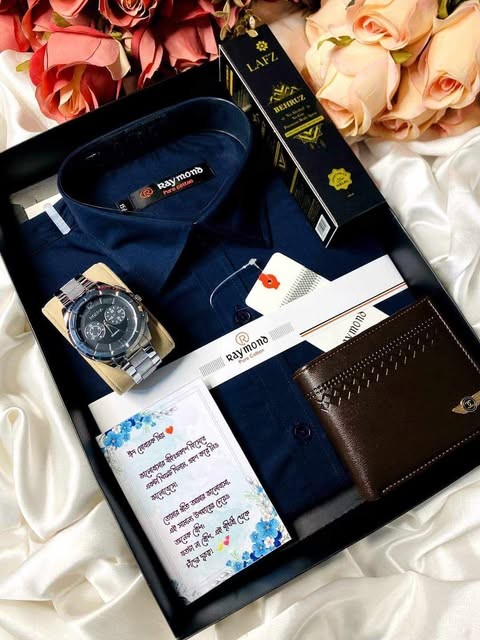 শাট কম্বো সেট সাইজ M/L/XL ঘড়ি. মানিব্যাগ. পারফিউম. গিফট কার্ড. বক্স