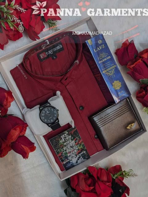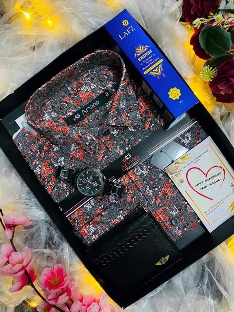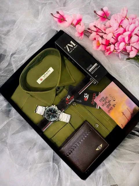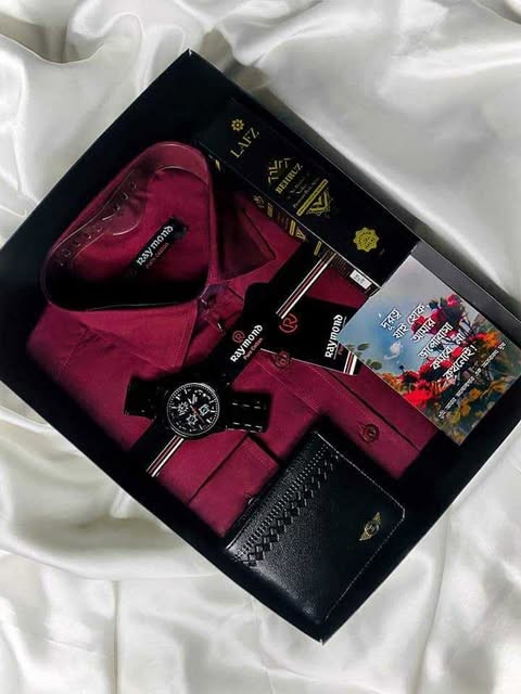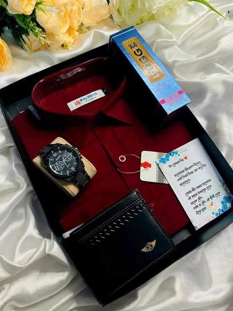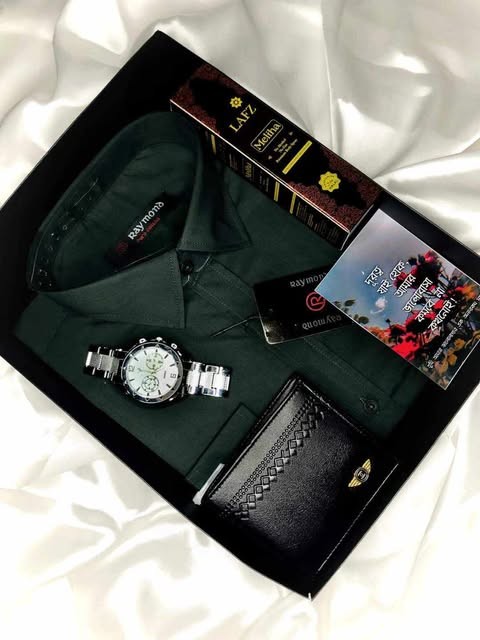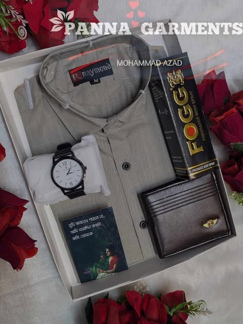 শাট কম্বো সেট সাইজ M/L/XL ঘড়ি. মানিব্যাগ. পারফিউম. গিফট কার্ড. বক্স